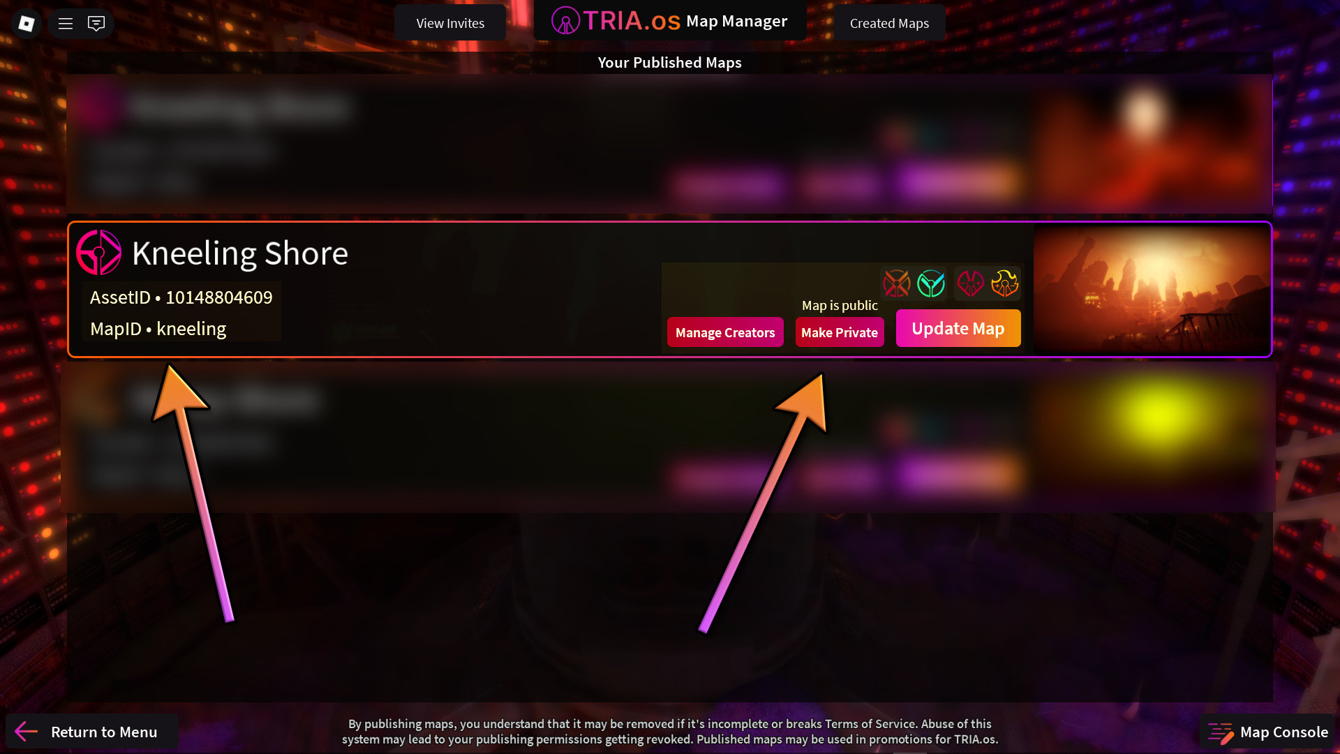 Once your map is complete, it’s time to publish it, which is necessary to begin the verification process and for the map to appear in the Map List. To do this, click Publish Map, and as long as the map meets all the publishing requirements, it’ll show up in Published Maps. The requirements include, but aren’t limited to:
