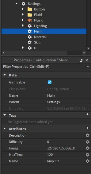 The main settings contain, well, all the main things about your map: name, description, image ID for your map thumbnail, max time in seconds (after which all players who haven’t beaten the map are killed, you can set this up to 10 minutes), and map difficulty number. There are 7 main difficulties: