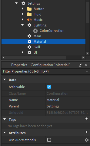 The materials settings allows you to switch between Roblox’s new, 2022 materials or continue using the older ones, which TRIA.os uses by default. You can also insert MaterialVariants into the Materials folder if you want to use custom PBR materials.